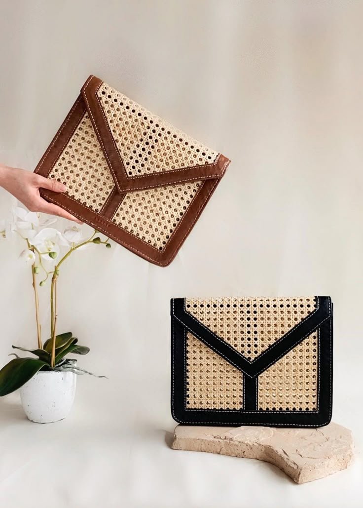 Handwoven Rattan Clutch Envelope Silhouette with a Structured Flap Closure and Bold Leather Trim Outlining. The envelope shape symbolizes communication, connection, and timeless style, while the rattan weave reflects openness, breathability, and harmony with nature. Combined with bold black leather trim.