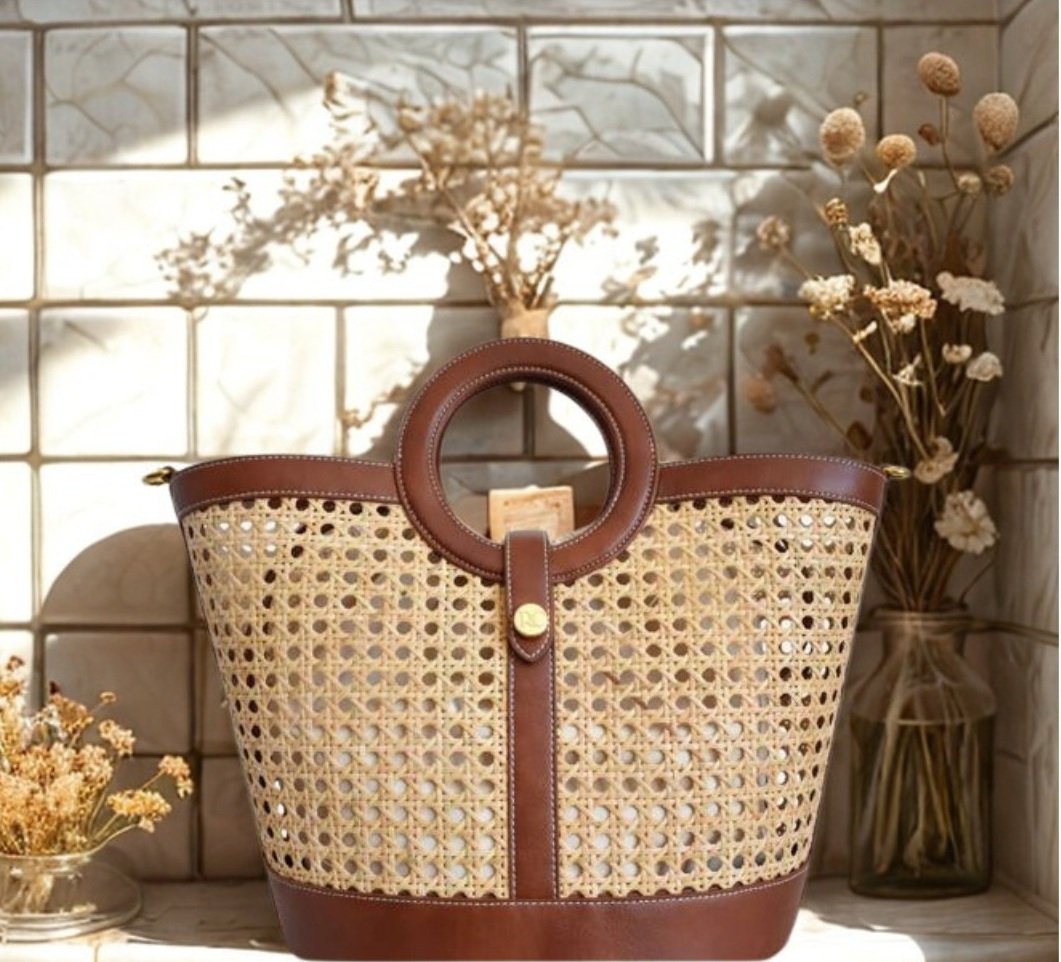 - Material: Natural woven fibers from rattan, with faux leather or original leather handles