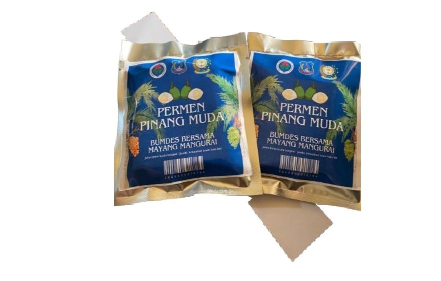 This product is Young Areca Nut Candy (Permen Pinang Muda), produced by BUMDes Bersama Mayang Mangurai. The candy uses young areca nut as its main ingredient, offering a distinctive flavor while supporting local village products. The production address is listed at Jalan Lintas Kuala Tungkal – Jambi, Kelurahan Bram Itam Kiri.